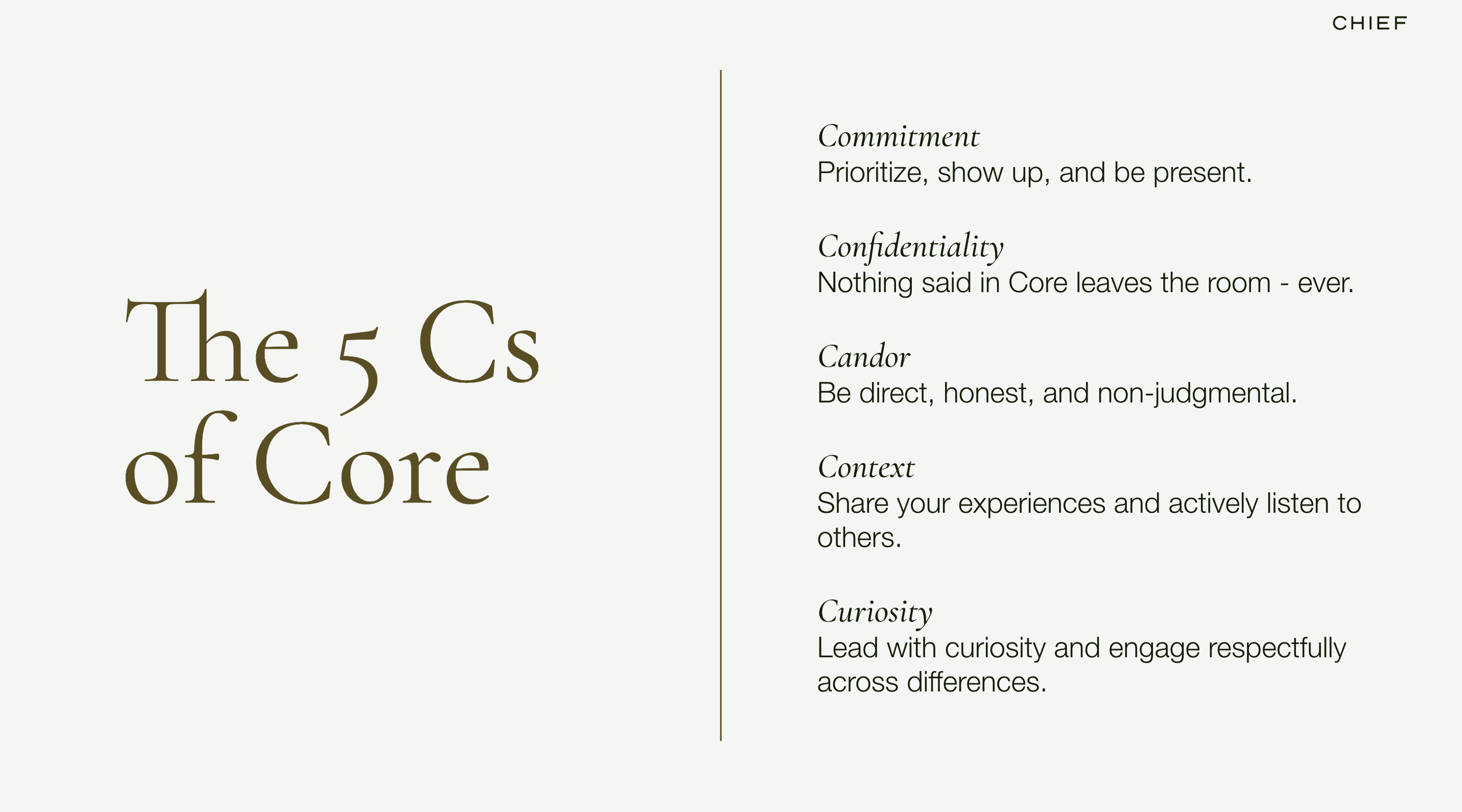 The 5 Cs are the grounding principles used to set norms and expectations during Core meetings. You’ll spend a good amount of time in Meeting 1 reviewing the 5 Cs in detail. Additionally, you may find yourself coming back to the 5 Cs often with your Core groups as a reminder of the commitments and expectations each member has within Core.