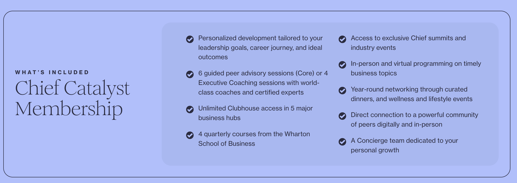 Chief membership offers an unmatched, broad array of benefits from Core to Coaching, to events, clubhouses, and so much more.