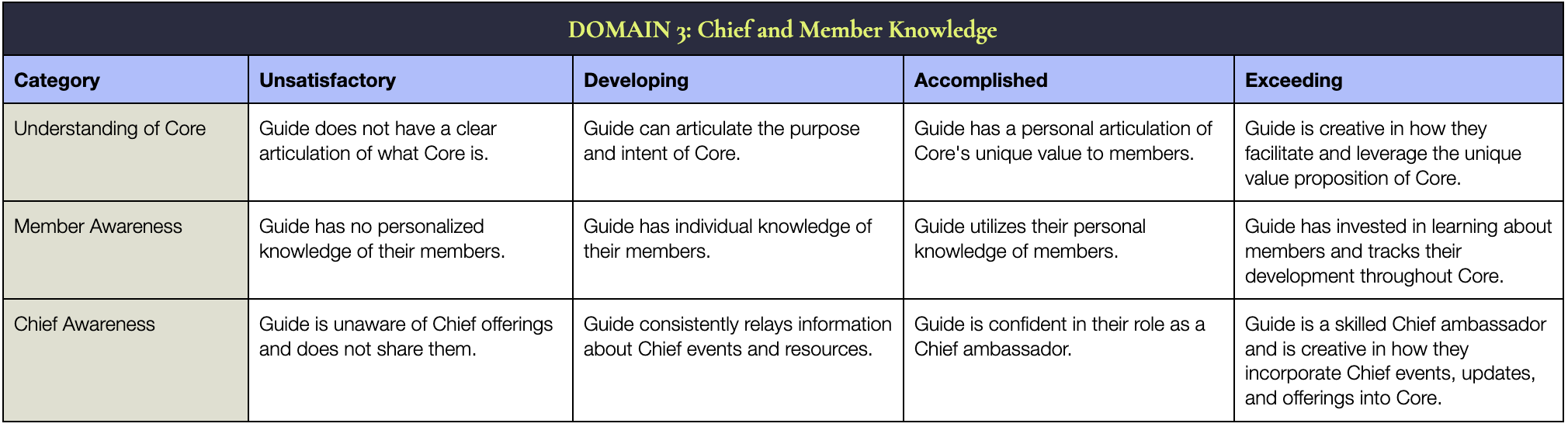 Share Chief’s point of view on the qualities and competencies that Guides should embody as a part of their work with Core groups and as a member of the Chief community.
