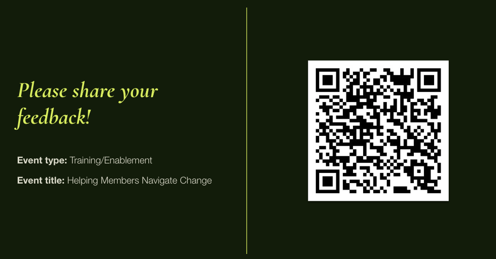 When completing the survey, you’ll be prompted to include the event type (Enablement/Training) and the event name (Helping Members Navigate Change).