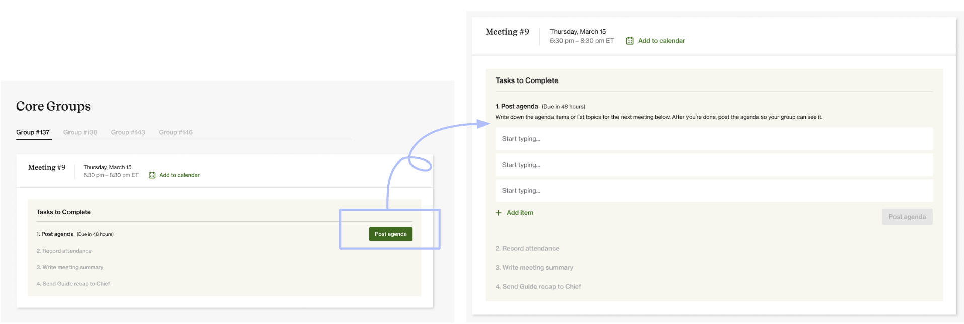 Guides are required to post a pre-meeting agenda at least 48 hours prior to any upcoming Core meeting. You can access the pre-meeting agenda in the Guide Portal on Chief.com. For meetings 1-3, you can find suggested agenda comms for each meeting in the content library Chiefguides.com. Please note that you cannot add or edit an agenda after a meeting date passes.