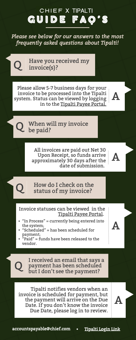 For any invoicing or payment issues, please contact accountspayable@chief.com.