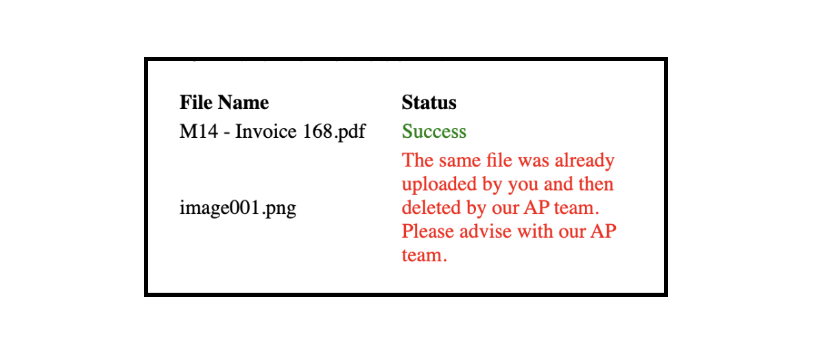 If you get an email with an image similar to the one below, the status in red refers directly to the .PNG image (likely picked up from an email signature). The file on the left corresponds to the status on the right. In this case, the invoice was accepted, and image001.png was deleted as it was not an image associated with the invoice.