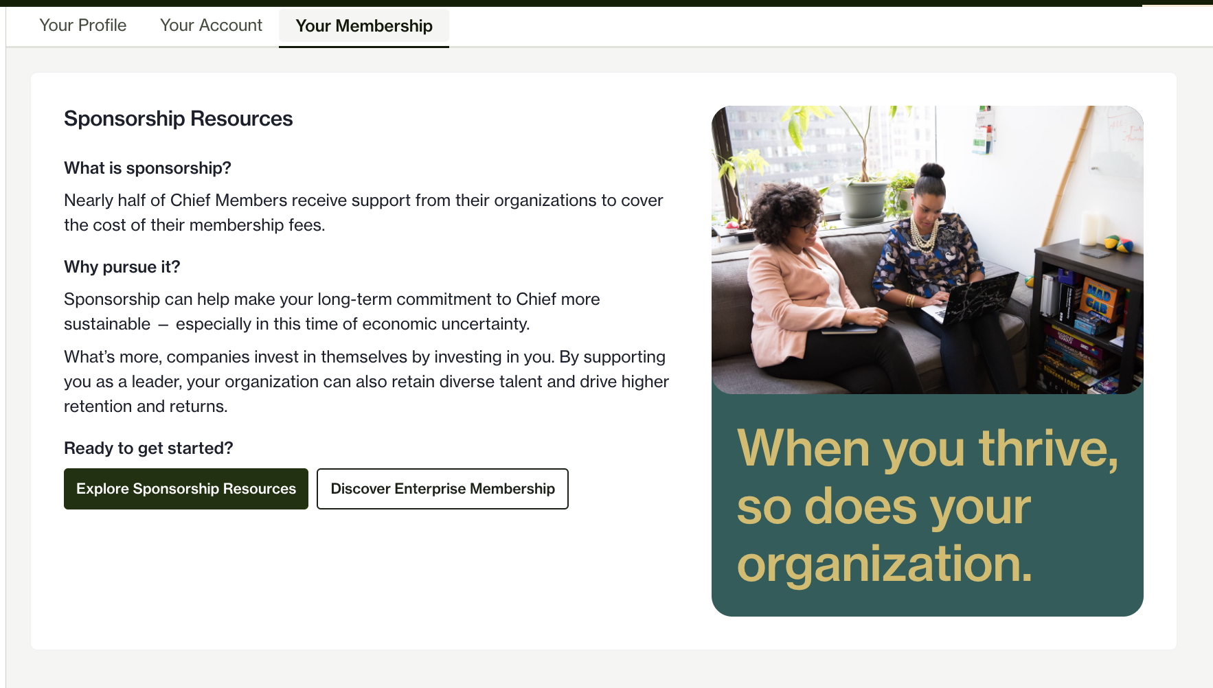 Many Chief members use sponsorships to pay for a portion or all of their Chief membership. Members can find information and resources on sponsorship by visiting the “Your Membership” tab on their profiles.